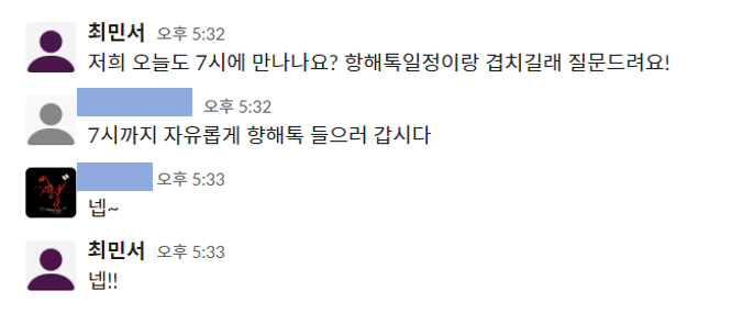 아까 말했듯 현재 팀에서는 카톡방을 아예 사용하지 않고 슬랙에서 소통하고 있다. 팀프로젝트를 진행하면서 당연히 나오는 사담(혹은 상대적으로 중요하지 않은 메시지)들은 따로 채널을 만들어서 사용한다. 또는 너무 개인적인 내용이라면 다이렉트 메시지를 이용하여 1:1대화도 가능하다.