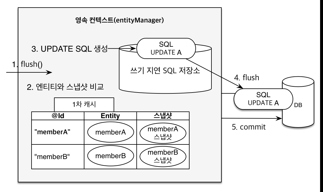 commit을 하면 내부적으로 flush()가 호출된다. 그때 JPA가 Entity와 스냄샷을 전부 비교한다.(내부적으로 최적화 알고리즘 짜져있다.) 비교를 해보고 memberA가 바꼈다면 update 쿼리를 쓰기지연SQL저장소에 만들어둔다. 그리고나서 이 쿼리들을 DB에 반영한다.