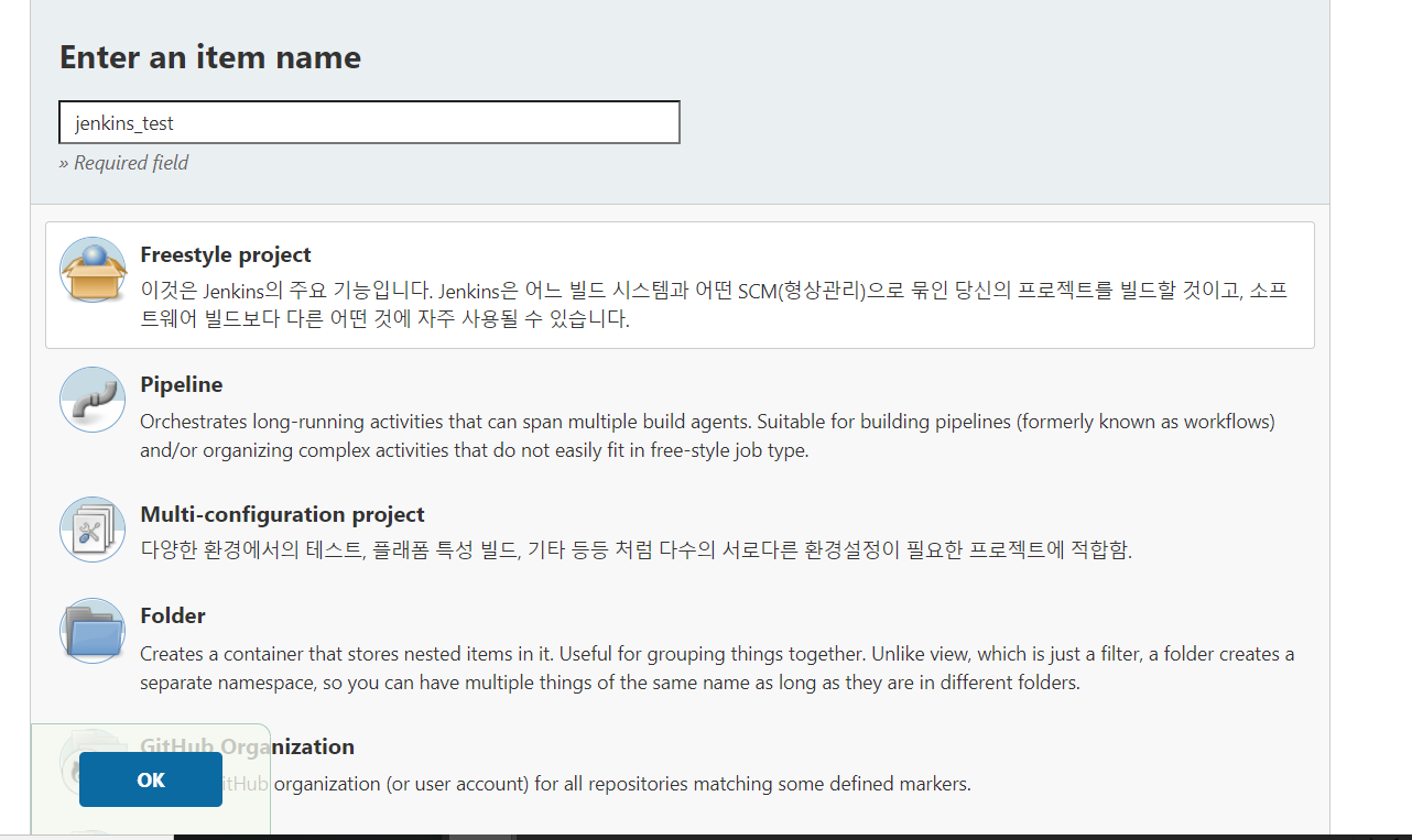 새로운 Item탭에 들어가 새로운 젠킨스 프로젝트를 만든다.