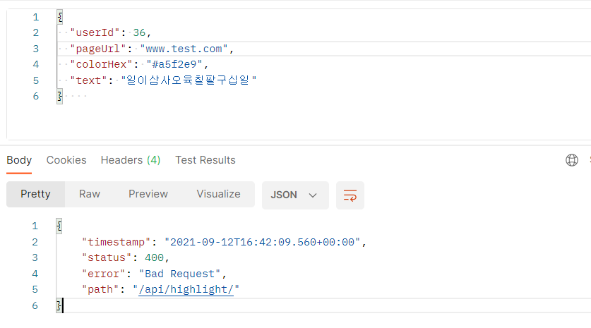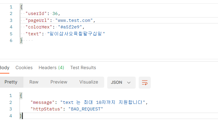 [Field error in object 'highlightCreateRequestDto' on field 'text': rejected value [일이삼사오육칠팔구십일];