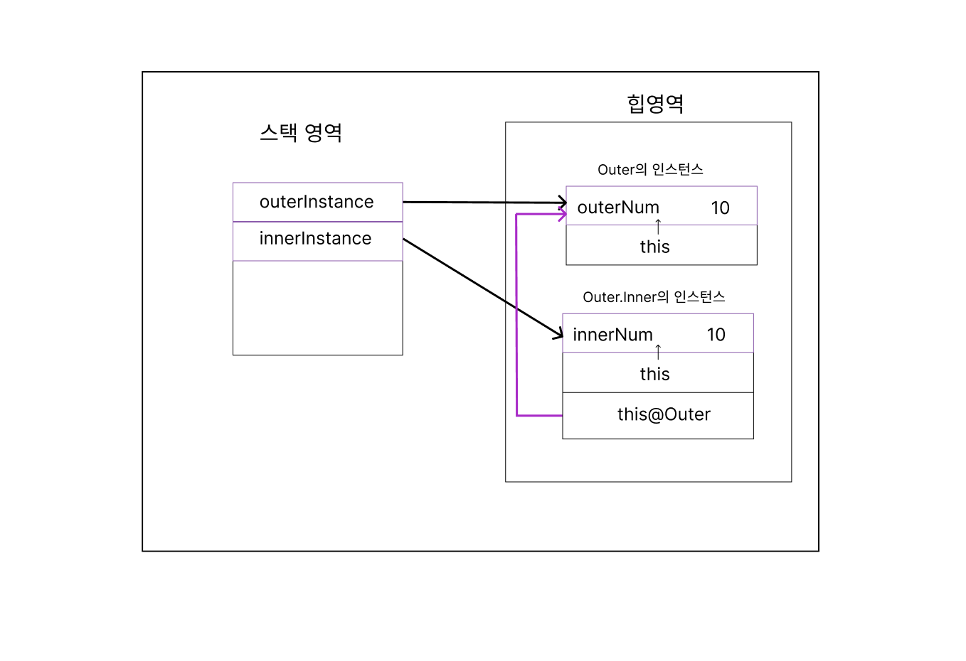 중첩 클래스의 경우 바깥 클래스의 인스턴스와 중첩 클래스의 인스턴스는 서로 어떠한 프로퍼티나 멤버 함수도 공유하지 않으며 완전히 별개의 클래스로 취급되었다. 중첩 클래스가 단순히 식별자만 속해있는 것이었다면, 내부 클래스는 인스턴스가 바깥 클래스의 인스턴스에 완전히 소속된다.