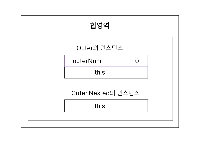Nested 클래스는 Nested라는 식별자만 Outer 클래스에 속해있을 뿐, 실제로는(물리적으로는) 완전히 분리된 장소에 있다. 따라서 Nested 클래스의 멤버함수는 Outer 클래스의 프로퍼티나 멤버 함수에 접근할 수 없다.