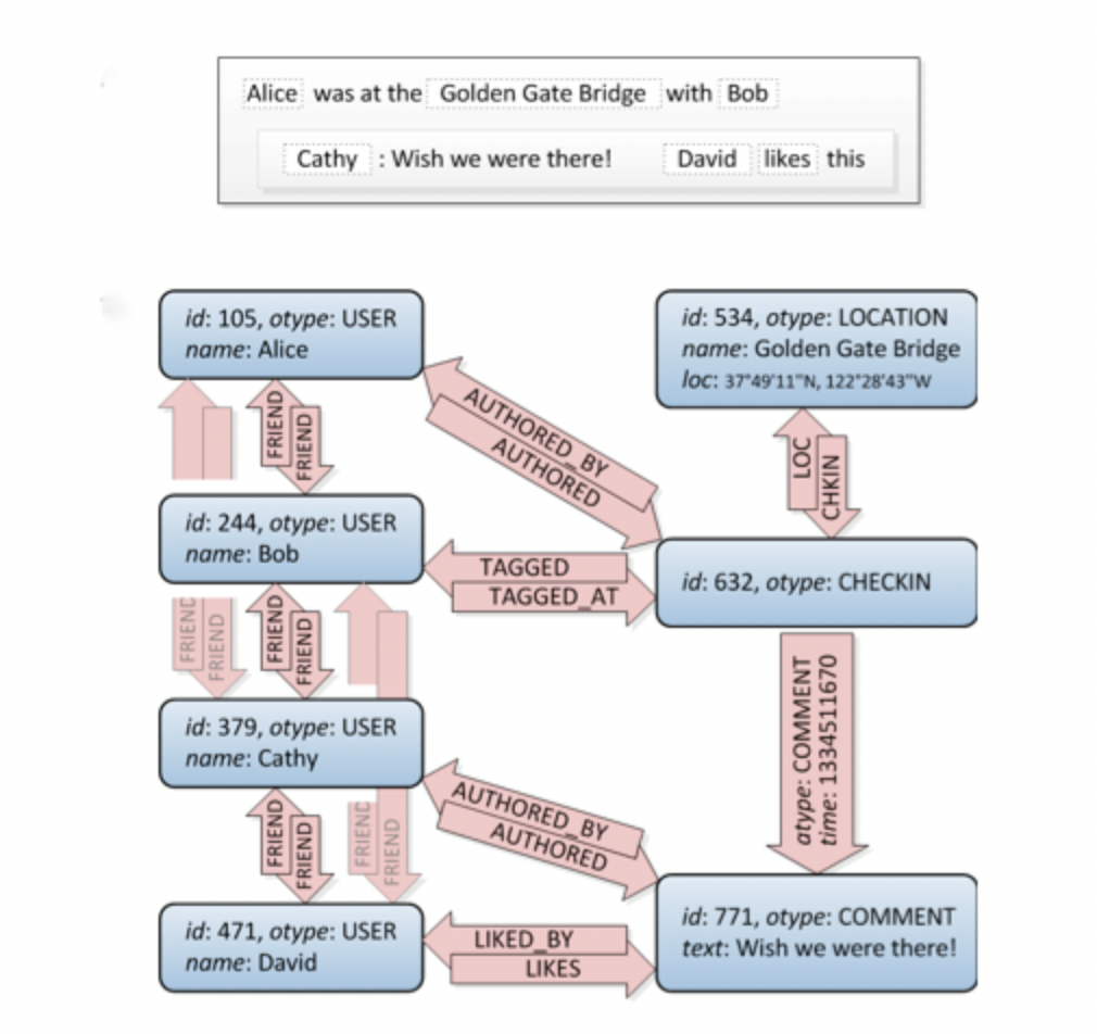 “์จ๋ฆฌ์ค๊ฐ Golden Gate Bridge์ ๊ฐ์ ์น๊ตฌ์ธ bob์ ํ๊ทธํ๋ค, Golden Gate Bridge์ ๊ฐ ๊ธ์ bob์ ์น๊ตฌ์ธ Cathy๊ฐ ๋๊ธ์ ๋จ๊ฒผ๊ณ , ๊ทธ ๋๊ธ์ Cathy์ ์น๊ตฌ์ธ David๊ฐ ์ข์์๋ฅผ ๋๋ ๋ค.” ์ ๊ทธ๋ฆผ์ด ํํํ๋ ๋ฌธ์ฅ์ด๋ค. ์ด ๋ฌธ์ฅ์ ๋ง์ฝ์ ๋ด๊ฐ ๊ฐ์ฅ ์ฒ์์ ๋งํ์๋ OR ์ ์ฌ์ฉํ์๋ค๋ฉด, ํผ๋๋ฅผ ๊ตฌ์ฑํ๊ธฐ ์ํด์ ์๋ง์ ํ ์ด๋ธ๊ณผ ์บ์๋ค์ ํค์ง๊ณ ๋ค๋ ์ด์ผํ ๊ฒ์ด๋ค. “์ด๋ป๊ฒ ํ๋ฉด ์ต์ํ์ ๊ตฌ์กฐ๋ก ์ต๋ํ์ ํํ๋ ฅ์ ๊ฐ์ง๋ฉฐ ํผ๋ ์ ๋ณด๋ฅผ ๋น ๋ฅด๊ฒ ์ฝ์ ์ ์์๊น?”์ ๋ํ ๊ณ ๋ฏผ์ ๋ต์ผ๋ก ํ์ด์ค๋ถ์ ๊ทธ๋ํ ์๋ฃ ๊ตฌ์กฐ๋ฅผ ์ฌ์ฉํ์๋ค.