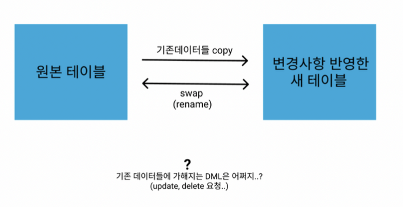 - 임시 테이블을 생성하여 DDL을 반영하고, 기존 테이블의 데이터를 복사한 후 기존 테이블과 이름을 변경하는 방식이다.