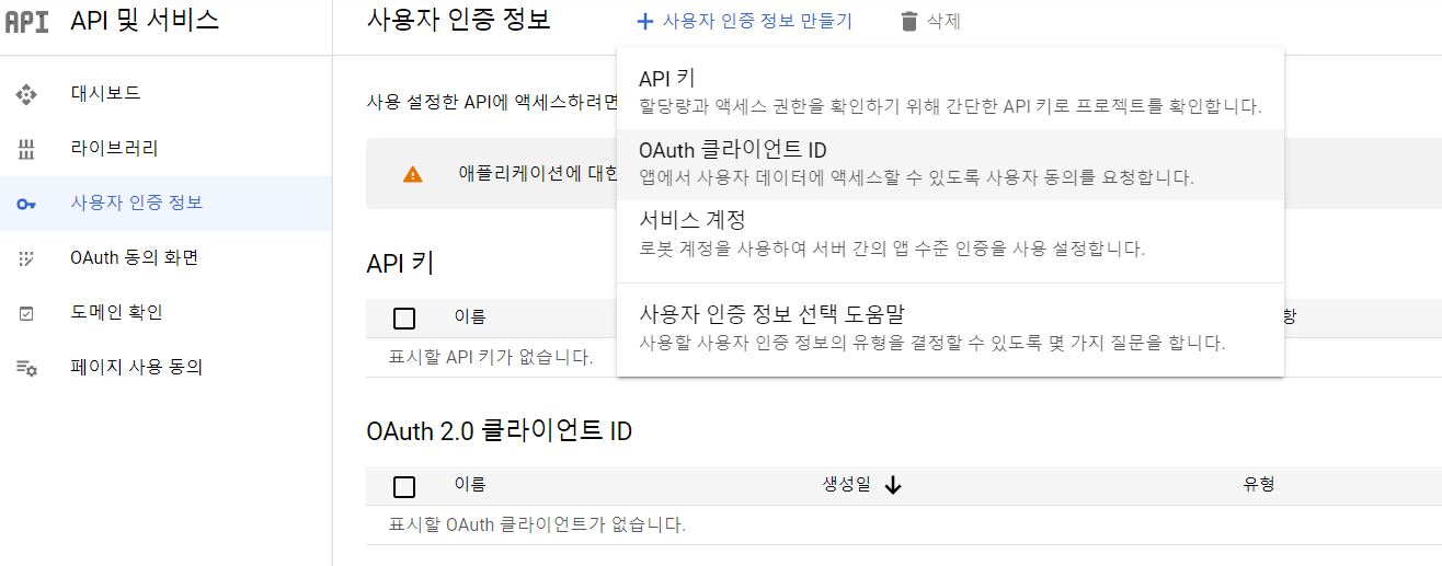 동의화면을 모두 만들었다면 다시 OAuth 클라이언트 ID를 발급페이지로 간다.