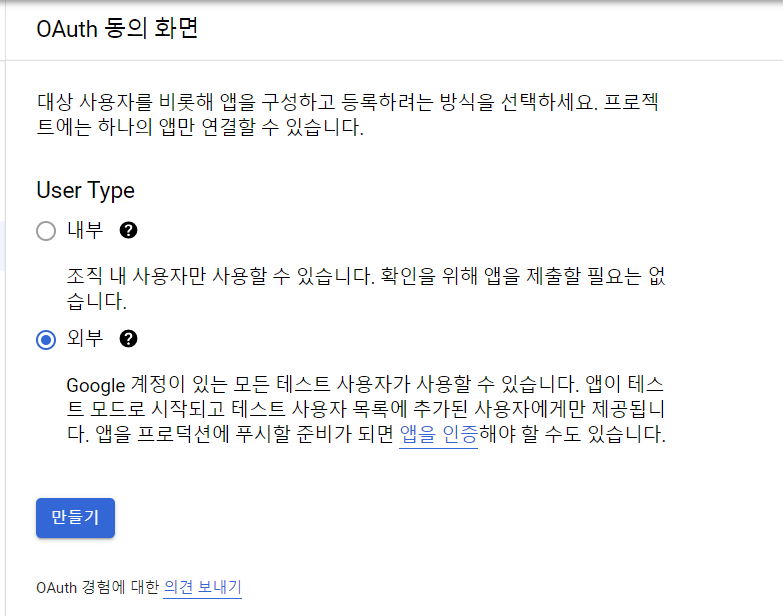 OAuth 클라이언트 ID를 발급받는다. 그전에 동의화면을 만들어야함으로 동의화면 페이지로 넘어간다.