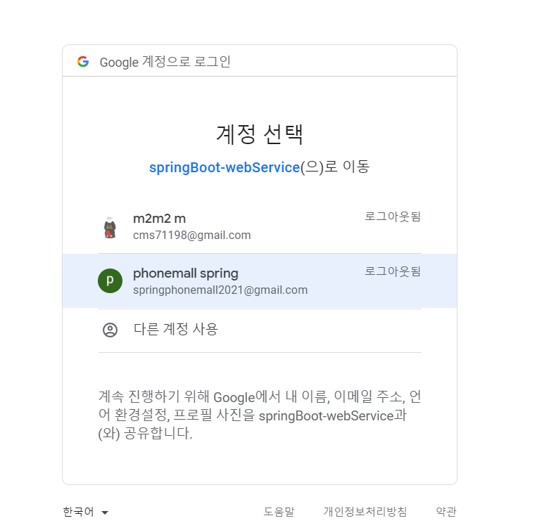userNameAttributeName이나 registrationId는 사실 구글 로그인에서는 필요없는 설정이지만 후에 OpenId Provider가 아닌 다른 소셜서비스(네이버, 카카오)를 고려하여 만들어 놓았다.
