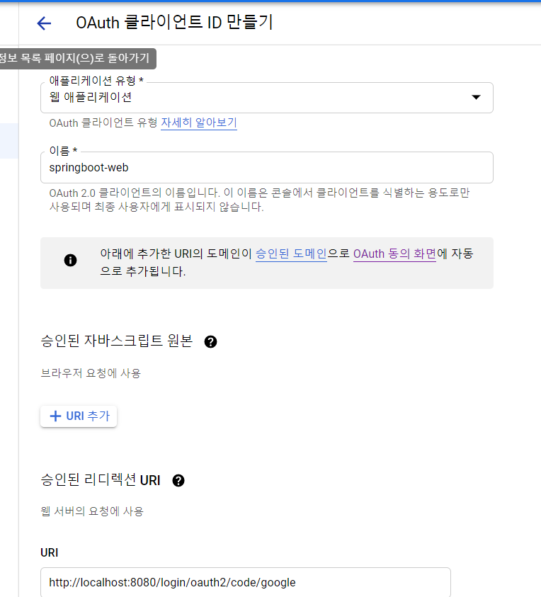 애플리케이션유형을 웹으로 지정하고 승인된 리다이렉션 URL을 설정해준다.