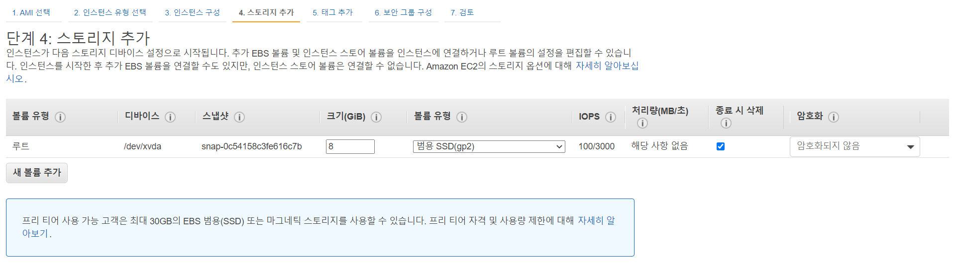 기본값을 8GB이다. 30GB까지 프리티어로 가능하기때문에 30GB설정한다.