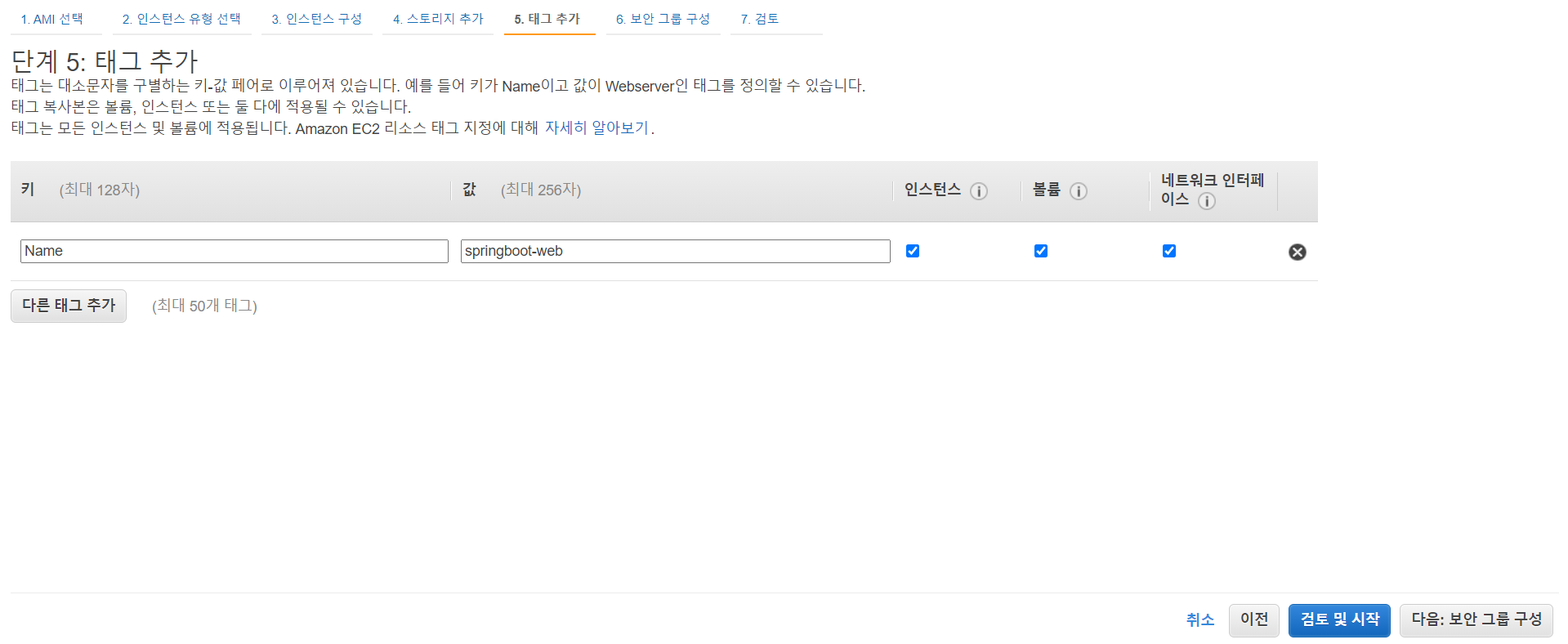 여러 인스턴스가 있을 경우, 태그를 통해 검색이나 그룹 지을 수 있다. 본인 서비스의 인스턴스를 나타낼 수 있는 값으로 등록하면 된다.