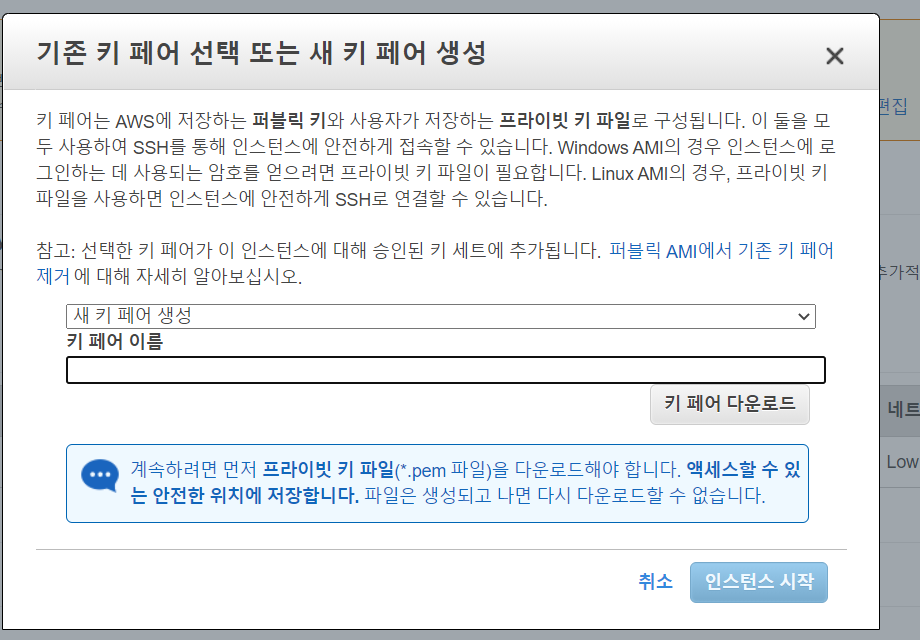 pem키는 최초 한번만 발급할 수 있다. 아마존에서 재발급해주지 않으니 잘 보관해야한다. 기존에 생성된 pem키가 있다면 선택하고 없다면 신규로 생성하면된다.