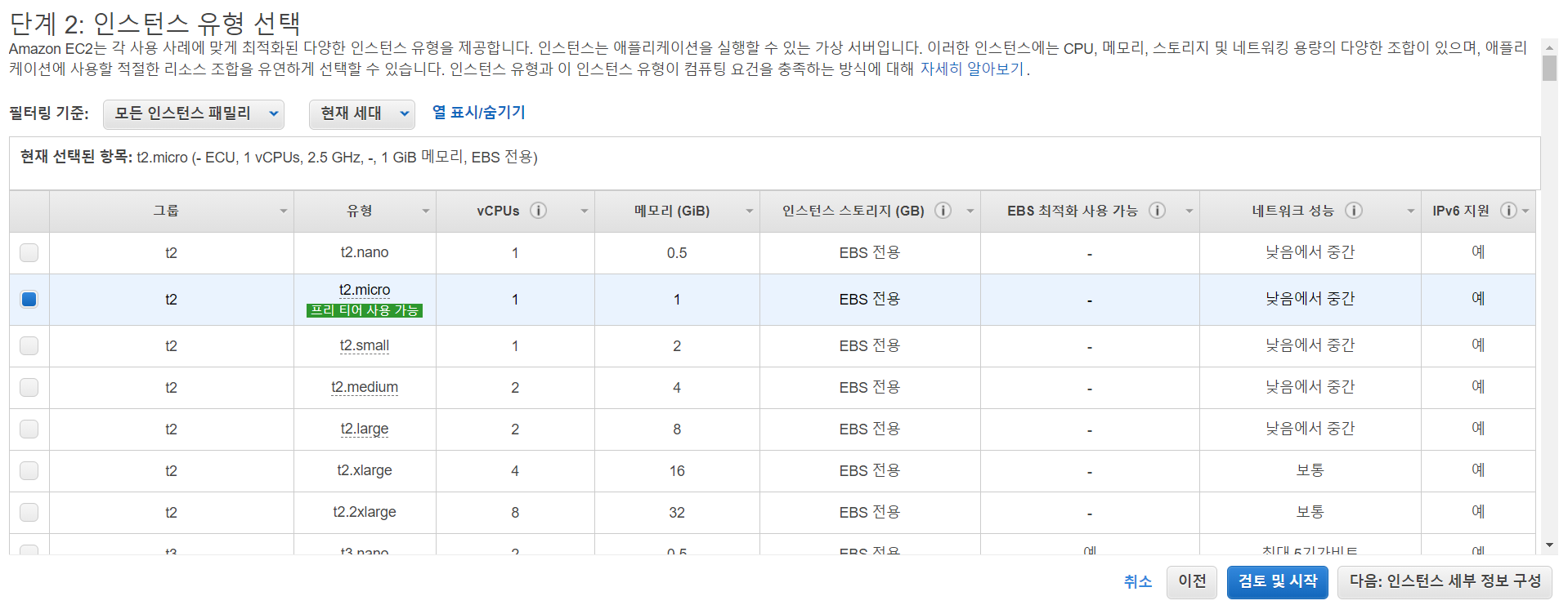t2.micro를 선택한다.
