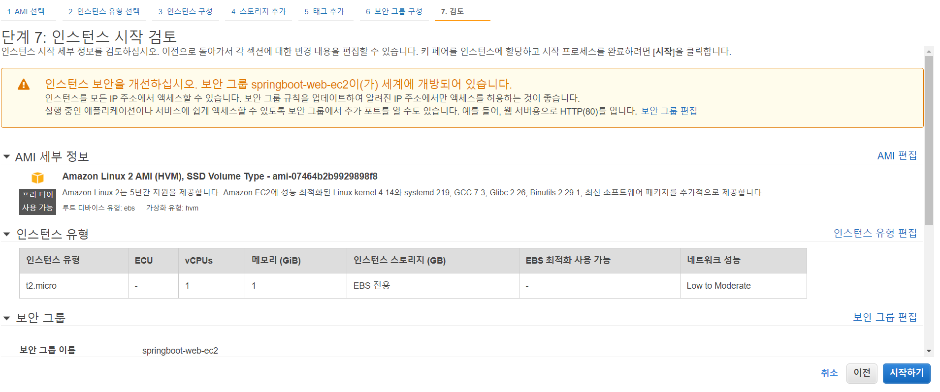검토화면에서 보안 그룹 경고를 하는데 8080이 전체 오픈되어서 발생하는 것이다. 8080을 열어놓는 것은 위험한 일은 아니니 바로 시작하기 버튼을 클릭한다.