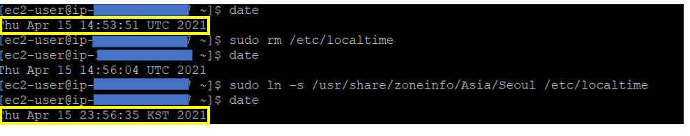 EC2 서버의 기본 타임존은 UTC이다. 이렇게되면 서버에서 수행되는 애플리케이션 시간도 모두 UTC기준이 되기때문에 타임존을 한국시간로 변경해야한다.