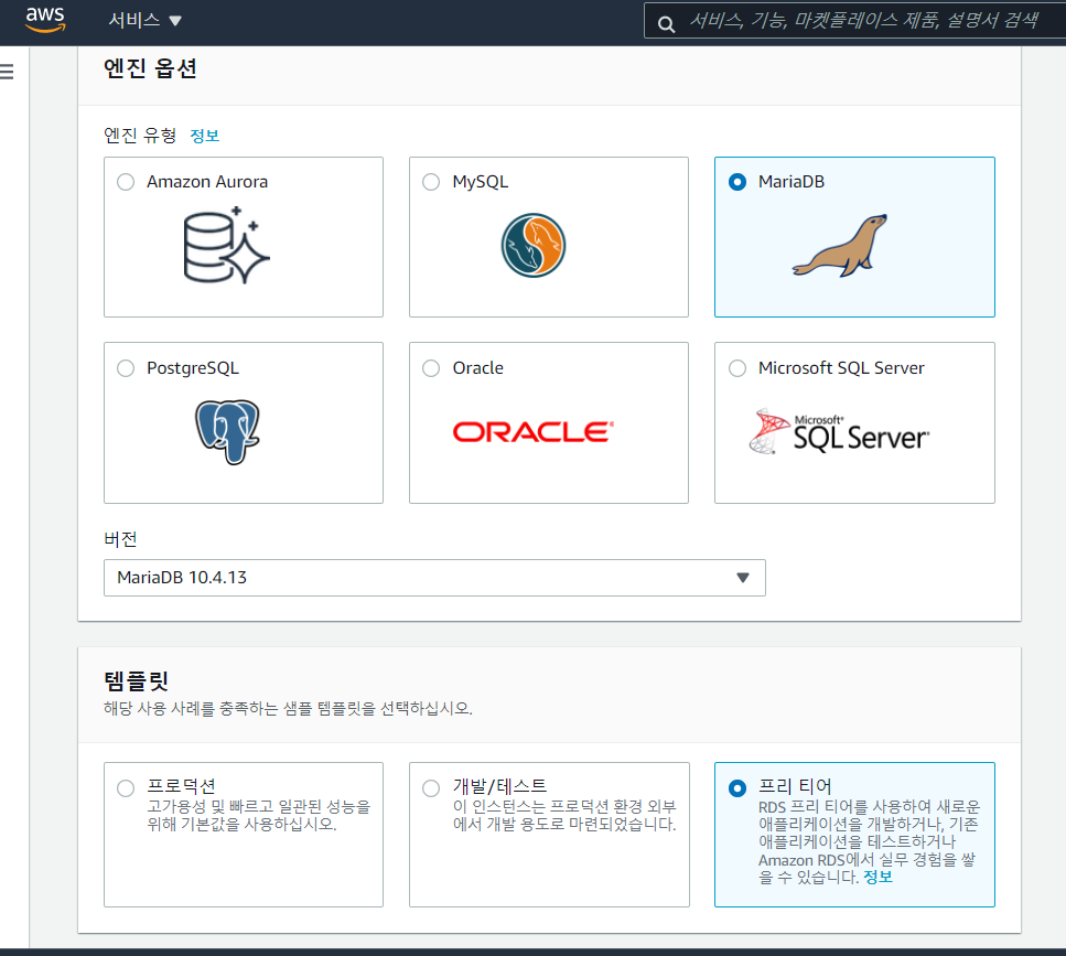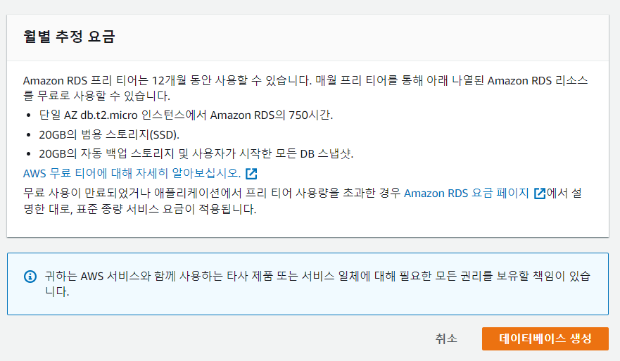 AWS 프리티어로는 RDS를 12개월동안 단일AZ db.t2.micro 인스턴스를 750시간 무료 사용할 수 있다.