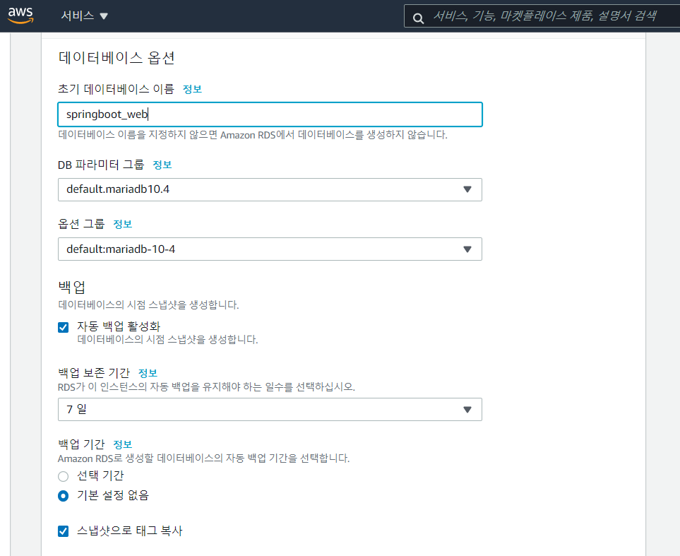 AWS에는 자동 백업을 해준다. 7일 백업하면 8일 넘은 데이터는 삭제하게된다. 백업 보존 기간을 올릴 수록 안전하겠지만 가격도 올라간다.