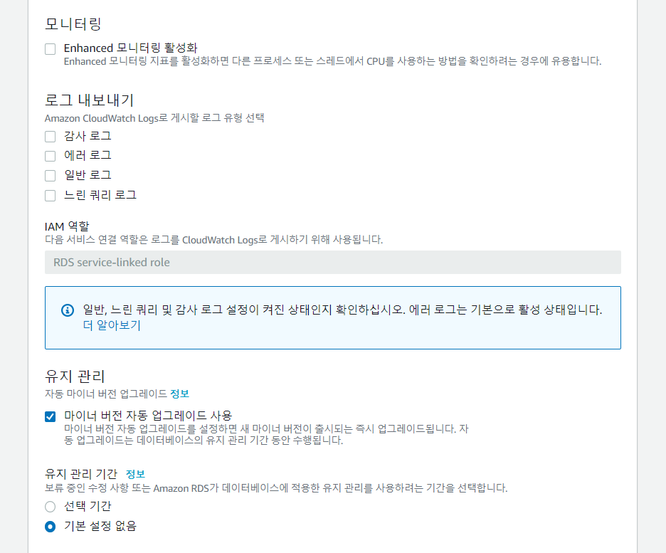 자동 백업 활성화를 시키면 AWS에서 데이터베이스의 작은 업그레이드는 알아서 처리한다.