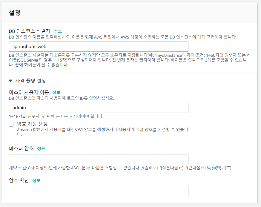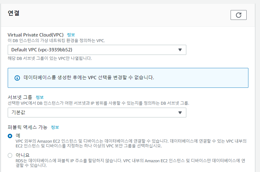 퍼블릭 액세스를 허용하지 않으면 데이터베이스에 직접 접근하지 못하고 같은 VPC안에 있는 EC2에서 우회 접속해야한다. 지금은 그냥 허용하기로 했다. 나중에 변경할 수 있다.