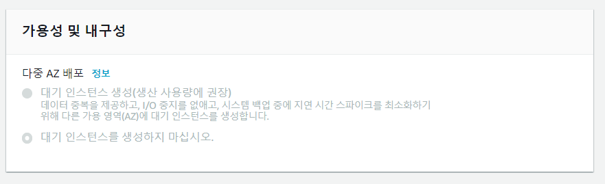 multi-AZ(가용구역서비스)를 선택하면 데이터을 서로 다른 AZ에 동시에 저장이된다.
