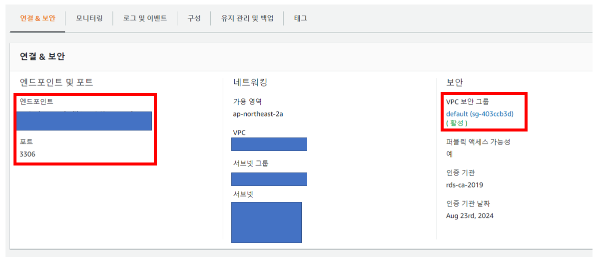 생성한 데이터베이스를 클릭해서 연결&보안 탭을 확인한다.