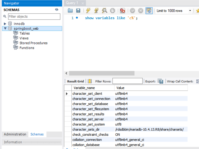 character_set, collation설정까지 모두 utf8mb4인지 확인한다.