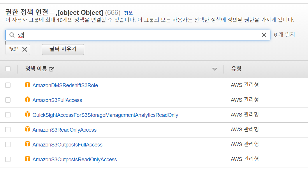원하는 정책을 추가한다. 나의 경우에는 S3FullAccess를 추가하였다.