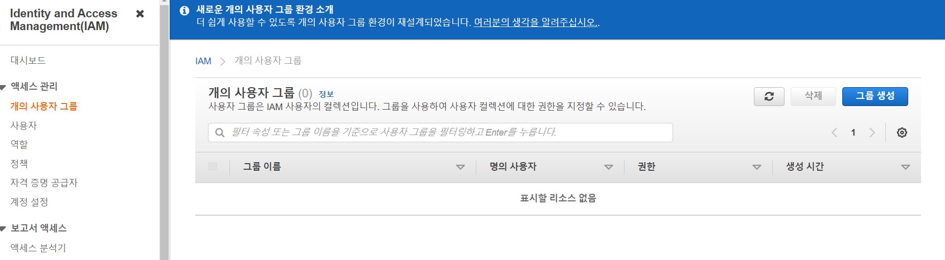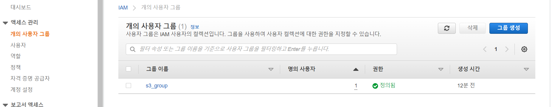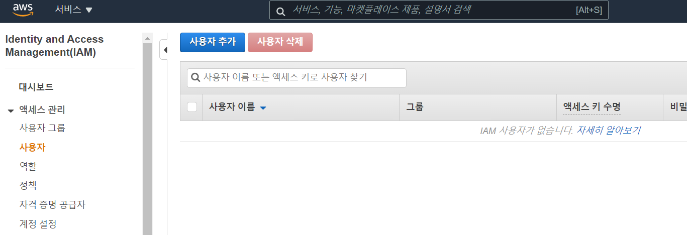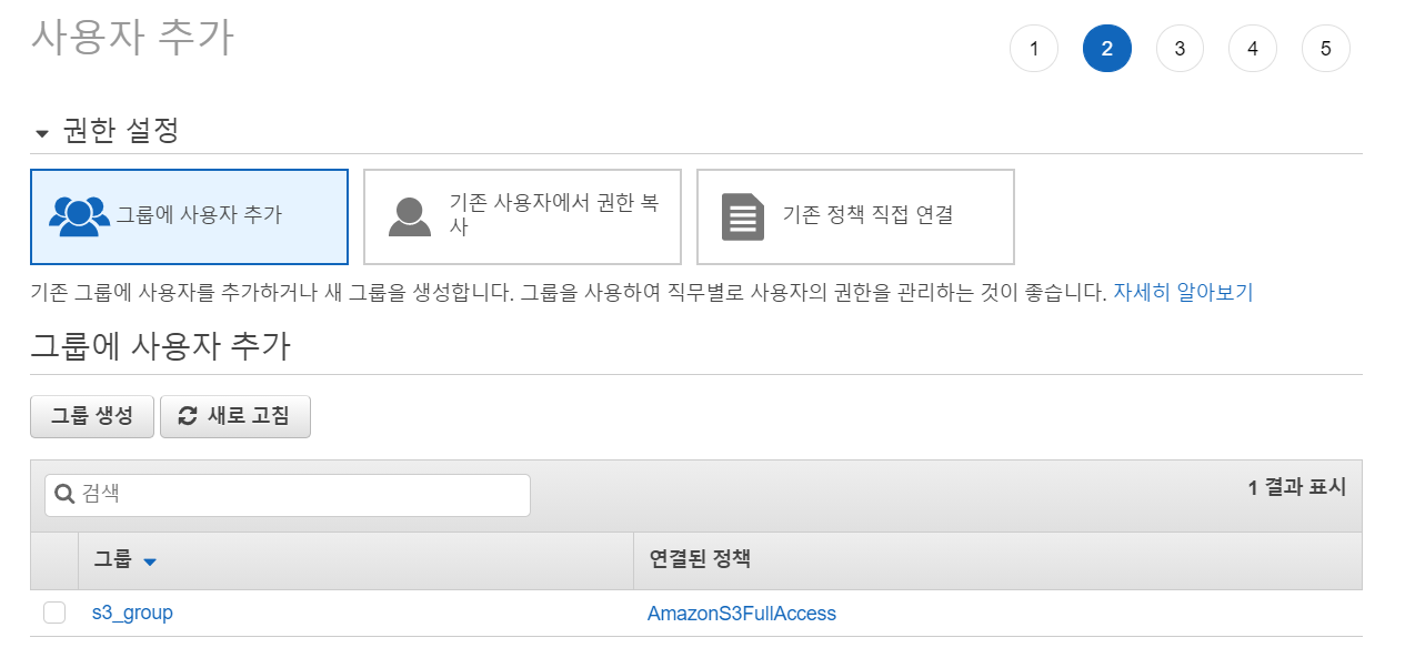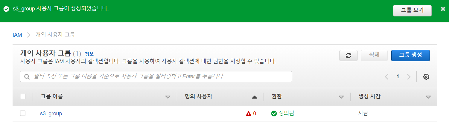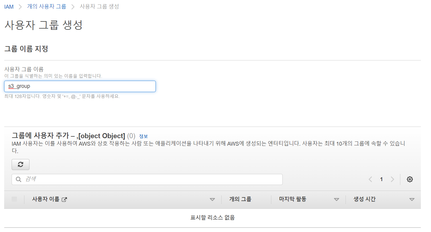 아직 User를 생성하지 않았기때문에 그룹에 사용자 추가하기는 넘어간다.