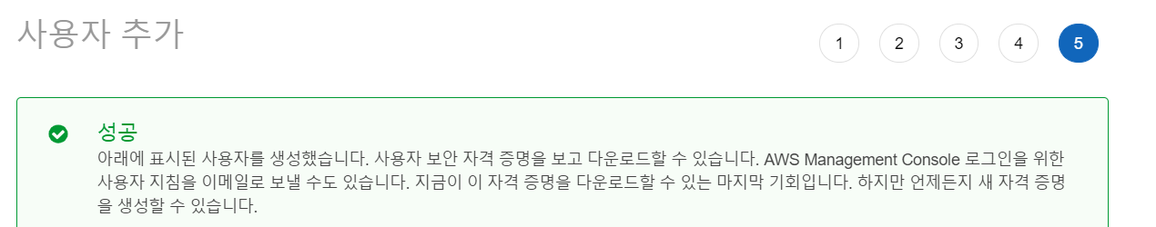 User가 생성완료 되었다면, 아래의 액세스키와 비밀액세스키를 잘 기록해둔다. 혹은 csv파일을 다운받는다.