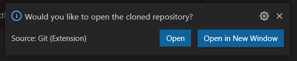 하단에 이런 알림이 뜨면 무사히 clone한것이다! clone한 리포지토리를 열어보겠냐고 해서 열어볼라면 open을 누르면된다.