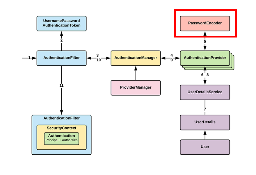 PasswordEncoder는 패스워드를 암호화 시킨다. 암호화되지 않은 실제 패스워드를 저장하거나 사용하는 일은 위험하다. 때문에 암호화된 패스워드로 저장하고, 사용자가 패스워드를 입력하면 이를 암호화해서 저장된 암호화된 비밀번호와 비교한다.