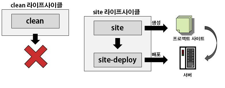 clean 라이프 사이클은 빌드한 결과물을 제거하며 site 라이프 사이클은 프로젝트 문서사이트를 생성한다.