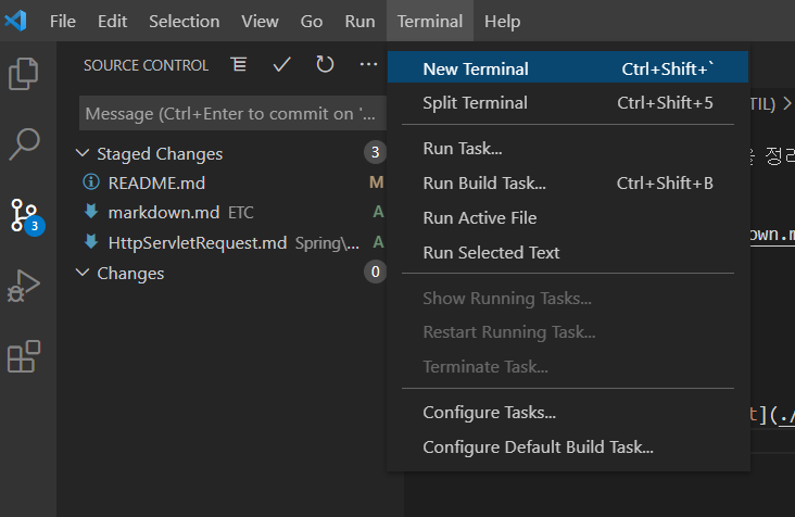 VS Code에서 수정을 다하고 git에 반영하고싶다. GUI를 이용하는 방법과 터미널을 사용하는 방법이 있다.