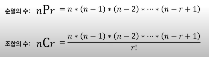 - 조합 : 서로 다른 n개에서 서로 다른 r개를 순서에 상관없이 선택
