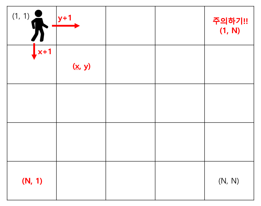 ์ฌํ๊ฐ A๋ N * Nํฌ๊ธฐ์ ์ ์ฌ๊ฐํ ๊ณต๊ฐ์์ ์์๋ค. ์ด๊ณต๊ฐ์ 1*1 ํฌ๊ธฐ์ ์ ์ฌ๊ฐํ์ผ๋ก ๋๋์ด์ ธ ์๋ค. ๊ฐ์ฅ ์ผ์ชฝ ์ ์ขํ๋ (1,1)์ด๋ฉฐ ๊ฐ์ฅ ์ค๋ฅธ์ชฝ ์๋ ์ขํ๋ (N, N)์ ํด๋นํ๋ค. ์ฌํ๊ฐ A๋ ์ํ์ข์ฐ ๋ฐฉํฅ์ผ๋ก ์ด๋ํ ์ ์์ผ๋ฉฐ ์์ ์ขํ๋ ํญ์(1,1)์ด๋ค. ์ฐ๋ฆฌ ์์ ์ฌํ๊ฐ A๊ฐ ์ด๋ํ ๊ณํ์ด ์ ํ ๊ณํ์๊ฐ ๋์ฌ์๋ค.