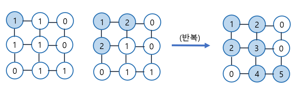 ๊ทธ๋ฌ๋ฉด ํ๋ฒ๋ ๋ฐฉ๋ฌธํ์ง ์์ ๊ณณ์ 1, ๊ฐ์ง ๋ชปํ ๊ณณ์ 0, ์ด๋ฏธ ๊ฐ ๊ณณ์ 1๋ณด๋ค ํฐ๊ฐ์ด๋ค.