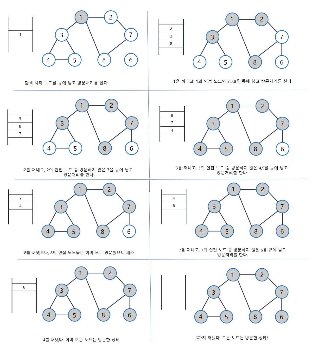 2. ํ์์ ๋ ธ๋๋ฅผ ๊บผ๋ด ํด๋น ๋ ธ๋์ ์ธ์ ๋ ธ๋ ์ค์์ ๋ฐฉ๋ฌธํ์ง ์์ ๋ ธ๋๋ฅผ ๋ชจ๋ ํ์ ์ฝ์ ํ๊ณ ๋ฐฉ๋ฌธ์ฒ๋ฆฌ๋ฅผ ํ๋ค,
