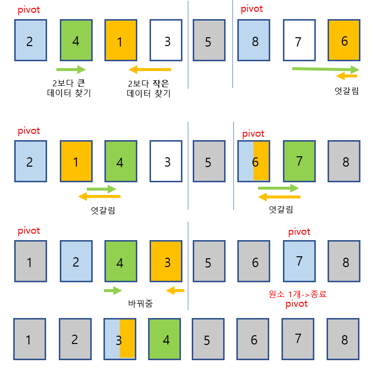 2. ์ผ์ชฝ์์๋ถํฐ๋ pivot๋ณด๋ค ํฐ ๋ฐ์ดํฐ๋ฅผ ์ฐพ๊ณ , ์ค๋ฅธ์ชฝ์์๋ถํฐ๋ pivot๋ณด๋ค ํฐ ๋ฐ์ดํฐ๋ฅผ ์ฐพ๋๋ค.