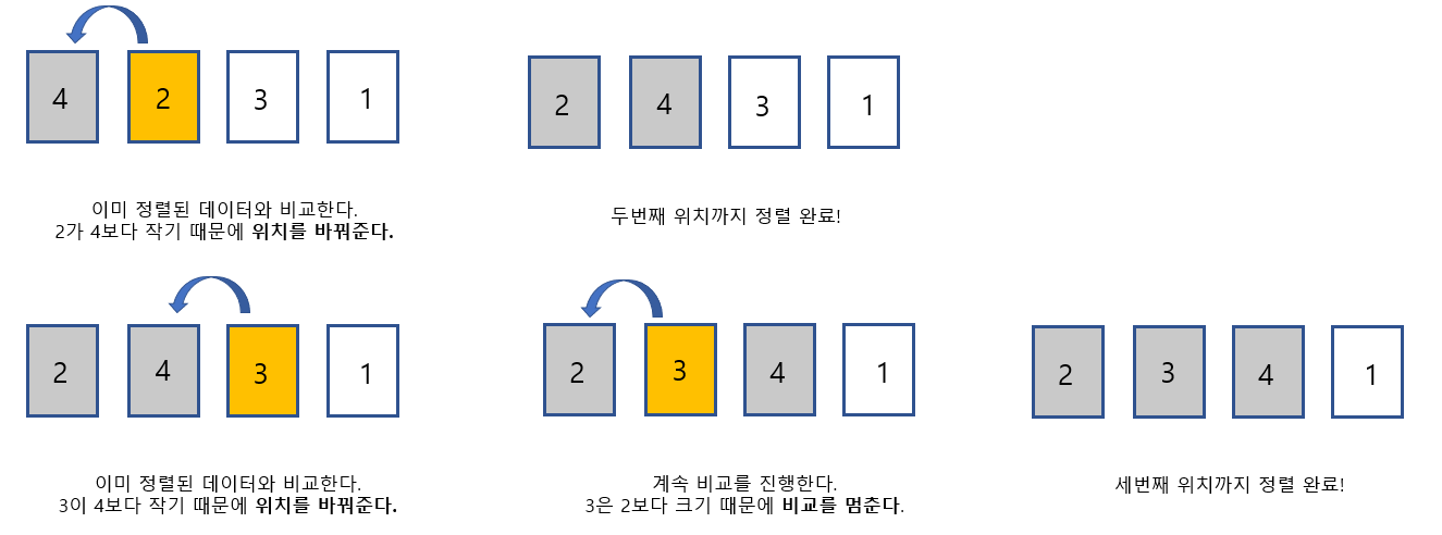์ด๋ฏธ ์ ๋ ฌ๋์ด์๋ ๋ฐ์ดํฐ์ ๋น๊ตํ์ฌ, ์์ ์ ์์น๋ฅผ ์ฐพ์ ์ฝ์ ํ๋ค.