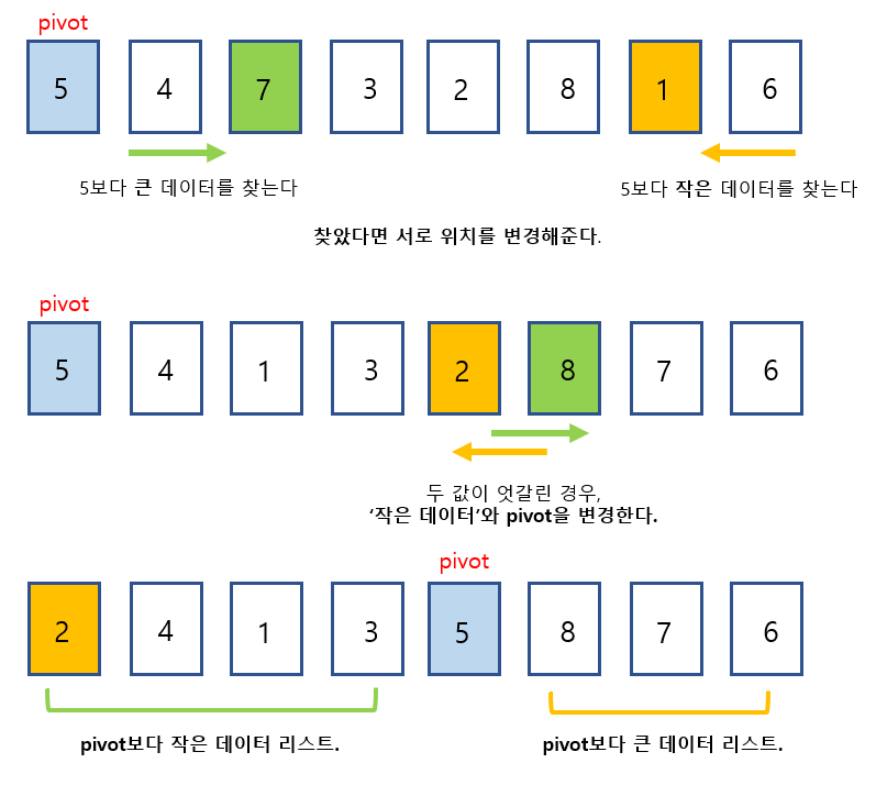 5. ์ด์ pivot์ ์ผ์ชฝ ๋ฐ์ดํฐ ๋ฆฌ์คํธ๋ ๋ชจ๋ pivot๋ณด๋ค ์๊ณ , ์ค๋ฅธ์ชฝ ๋ฐ์ดํฐ ๋ฆฌ์คํธ๋ ๋ชจ๋ pivot๋ณด๋ค ํฌ๋ค.