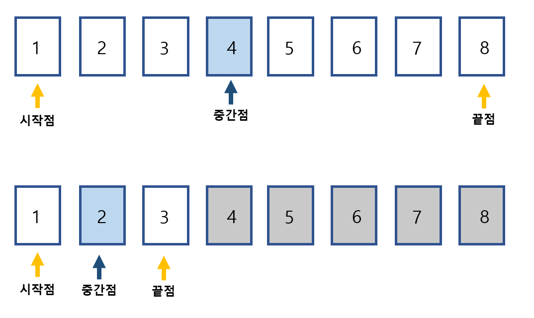 5. ์ฐพ์ผ๋ ค๋ ๋ฐ์ดํฐ๊ฐ ์ค๊ฐ์ ๊ณผ ์ผ์นํ ๋๊น์ง 1~4๊ณผ์ ์ ๋ฐ๋ณตํ๋ค.