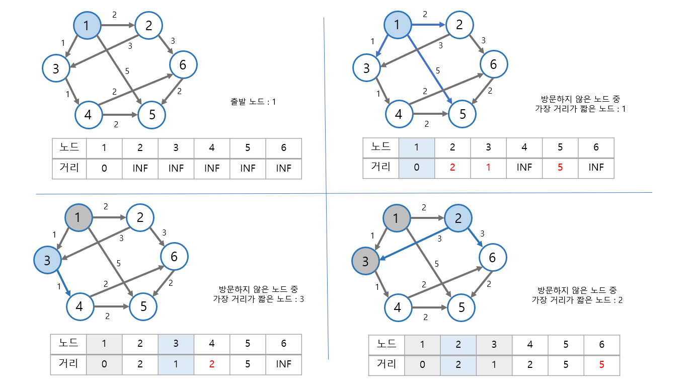 3. ๋ฐฉ๋ฌธํ์ง ์์ ๋ ธ๋ ์ค์์ ์ต๋จ๊ฑฐ๋ฆฌ๊ฐ ๊ฐ์ฅ ์งง์ ๋ ธ๋๋ฅผ ์ ํํ๋ค.