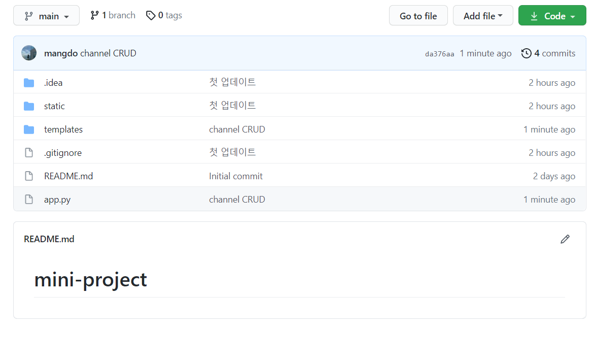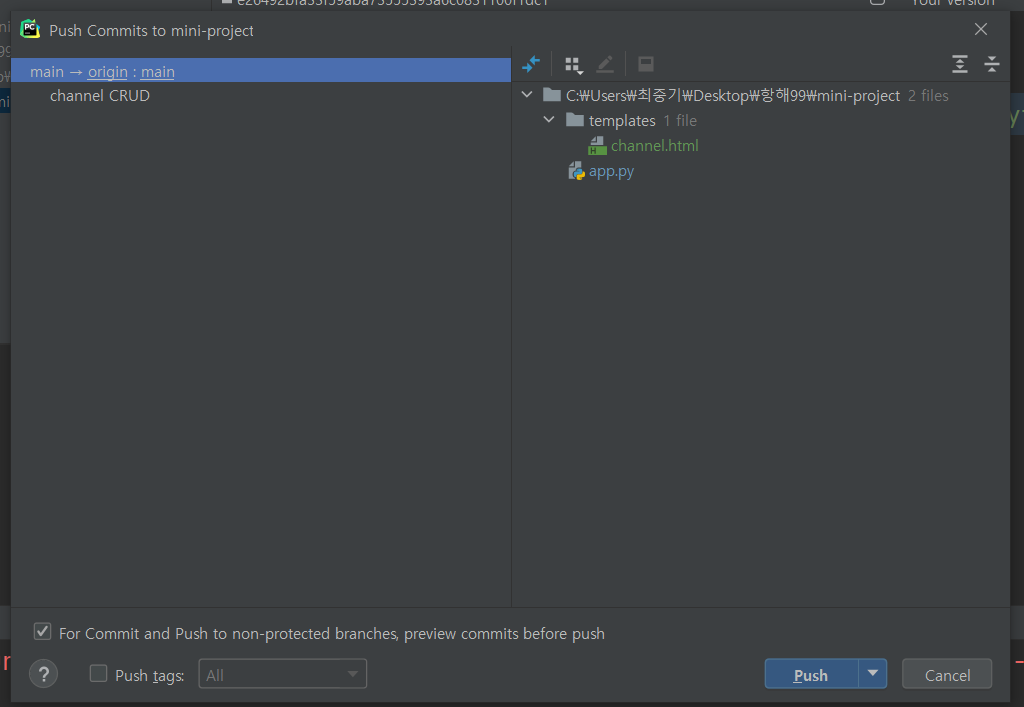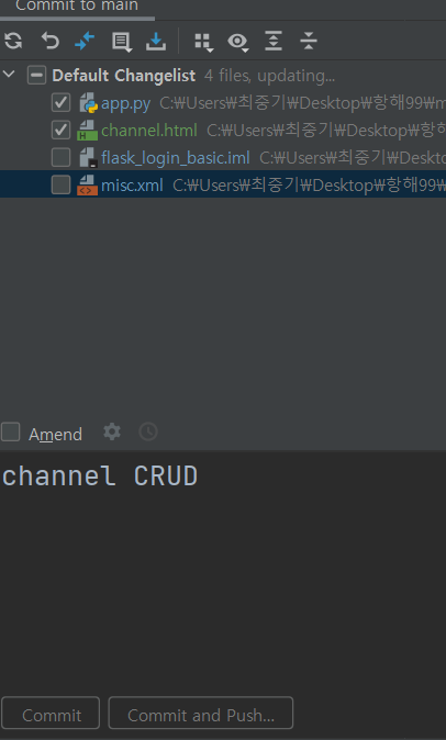 저같은 경우에는 channel CRUD 기능을 구현하여 커밋하는 것이기 때문에 channel CRUD라는 커밋메시지를 작성후, 커밋해주었습니다.