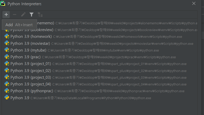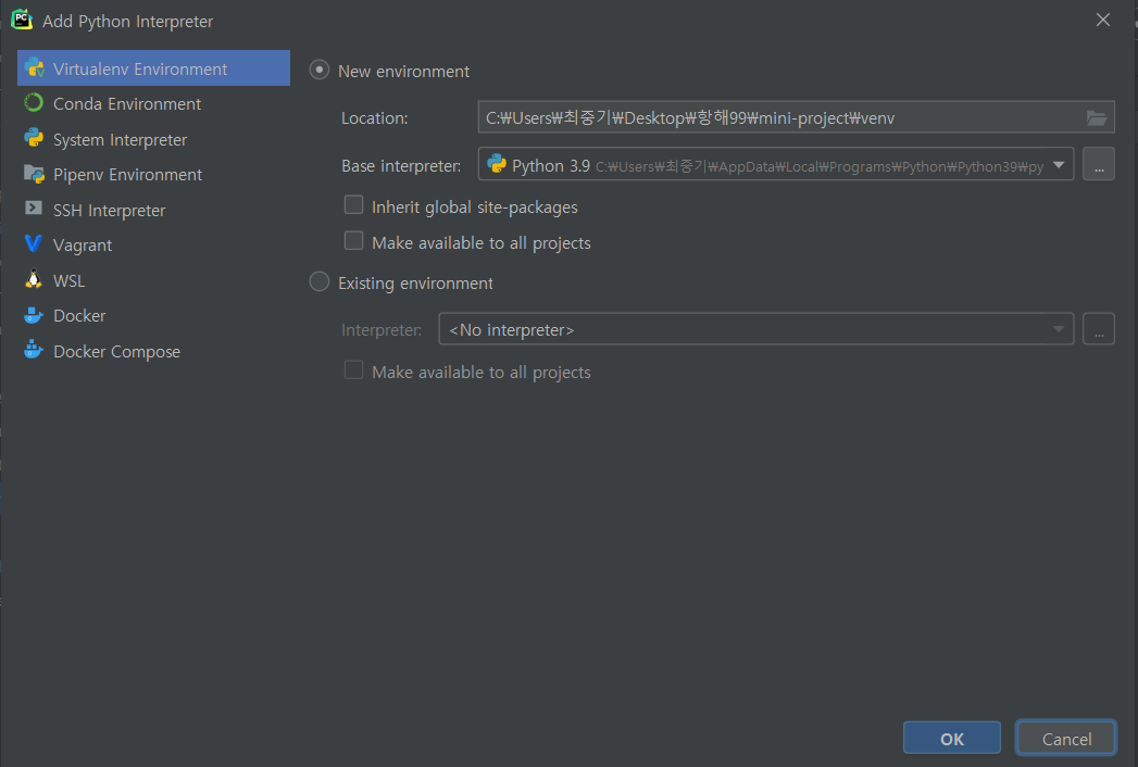 new enviroment를 클릭해주시고 프로젝트 폴더명에 /venv 가 있는지를 확인하시고 OK를 눌러줍니다.
