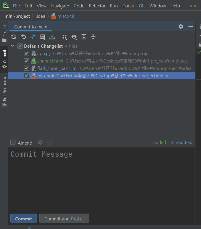 이때 commit 메시지는 의미있게 작성해주시는것이 좋습니다.