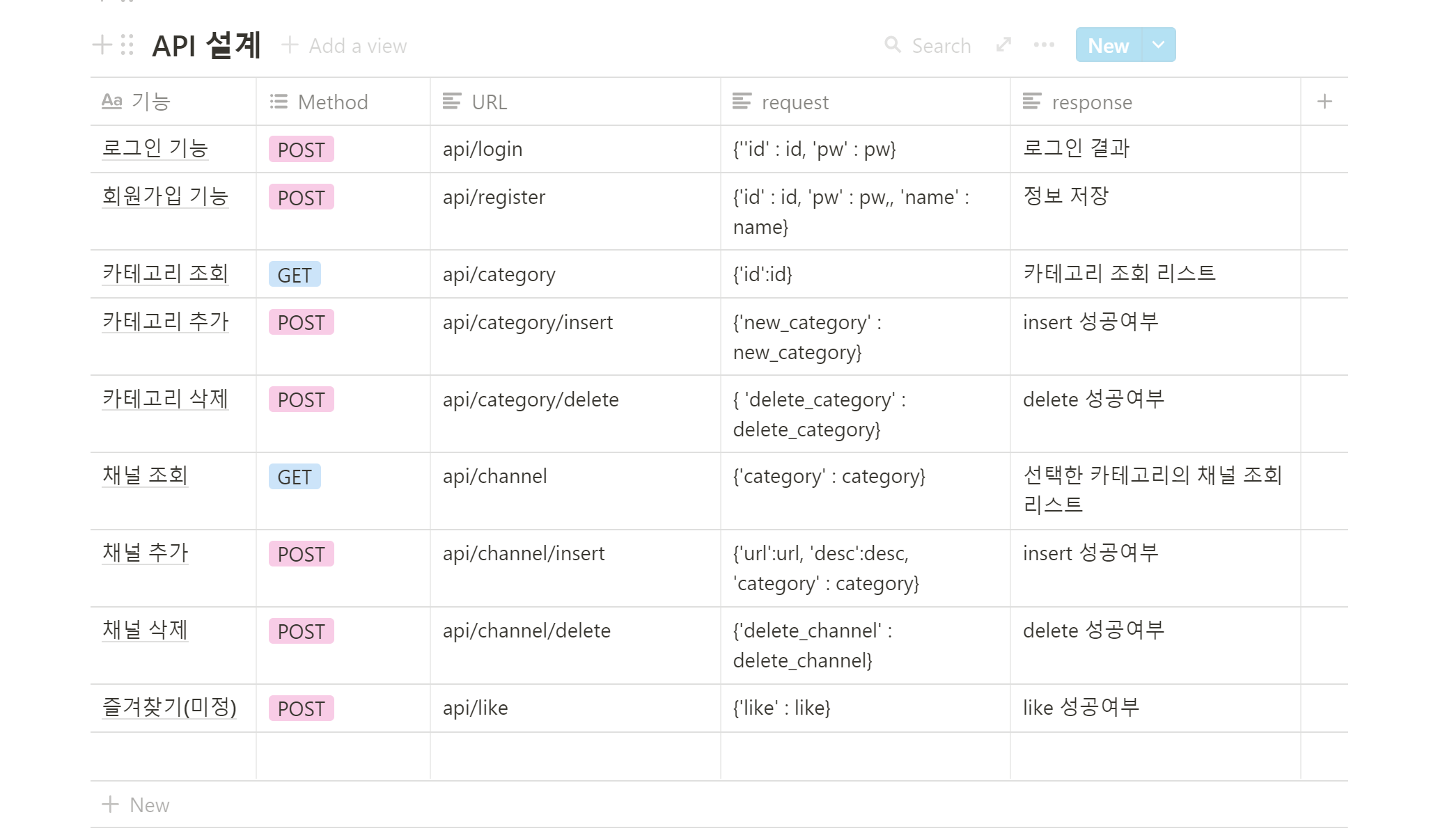 : MongoDB에 대한 설계가 아쉬움에 남습니다. 현 프로젝트에서는 사용자의 아이디를 카테고리 컬렉션에도, 채널 컬렉션에도 중복해서 들어가있습니다. 당시에 저는 유튜브 채널의 조회, 수정, 삭제는 해당 사용자만 가능하게 하고싶은 생각에 채널 컬렉션에도 사용자의 아이디를 넣었습니다. 하지만 프로젝트가 끝나고나서 생각해보니 데이터를 중복할 바에는 카테고리 컬렉션을 조회한 다음에 채널 컬렉션을 조회하는, 2개의 컬렉션을 잇따라 조회하는 법이 낫지 않았을까라는 생각이 들었습니다.