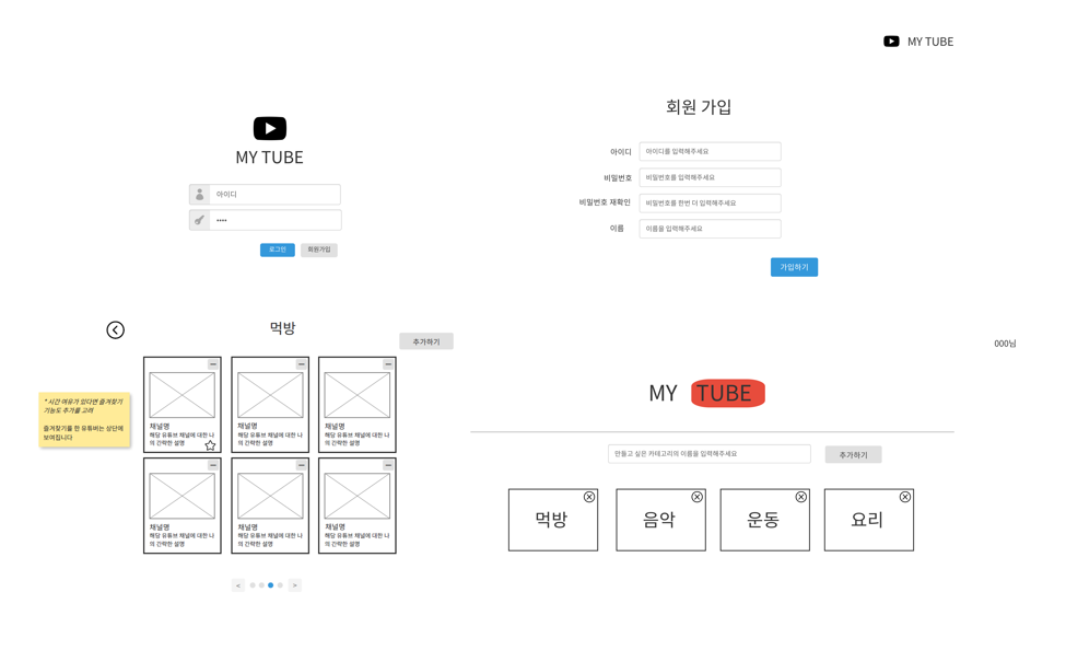 미디어 시장을 장악하고 있는 유튜브는 남녀노소 할 것없이 모두가 이용하고 있습니다. 다양한 유튜브 채널이 생겨나고 유튜브에서는 사용자마다 구독할만한 채널들을 항상 추천해주고 있습니다. 하지만 정작 구독한 채널을 관리하는 기능이 없어 불편함을 느끼고 있었습니다. 저희 조원들은 모두 이를 공감하며 유튜브 채널을 카테고리별로 나누어 관리할 수 있는 MyTube웹사이트를 제작하게되었습니다.