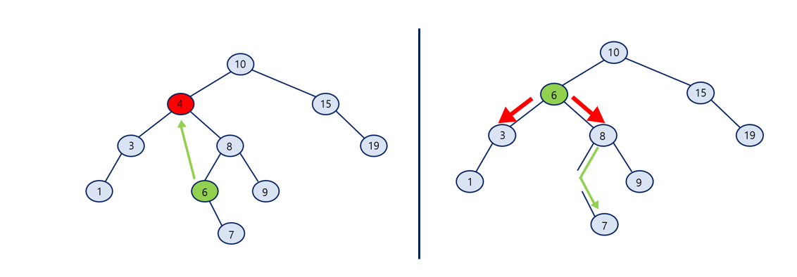 5. ํด๋น Node์ ์ค๋ฅธ์ชฝ branch๊ฐ ์ญ์ ํ Node์ ์ค๋ฅธ์ชฝ child Node๋ฅผ ๊ฐ๋ฅดํค๊ฒ ํจ