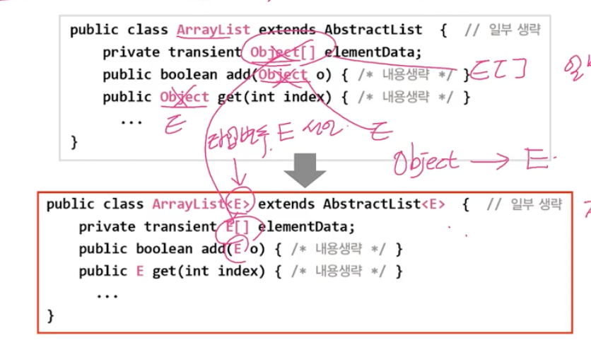 : 제네릭 클래스를 사용할 때는 어떤 타입인지를 지정해줘야한다. 이때 Object 타입 대신 타입변수(E)를 선언해서 사용한다. 변수 이름은 뭘 사용해도 상관없다. E말고도 X,Y도 쓸 수 있다. 기본적으로는 Type을 의미하기 때문에 T를 많이 사용하고 Element의 E를 사용하기도 한다. 보통 대문자 한글자로 사용한다.