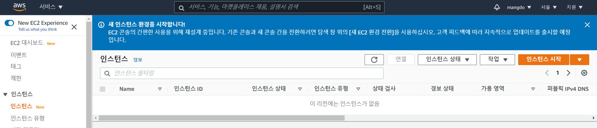 지금은 인스턴스가 없다고 뜨는데 아무런 대여를 하지 않았기 때문이다. 이제부터 컴퓨터를 대여해보자.