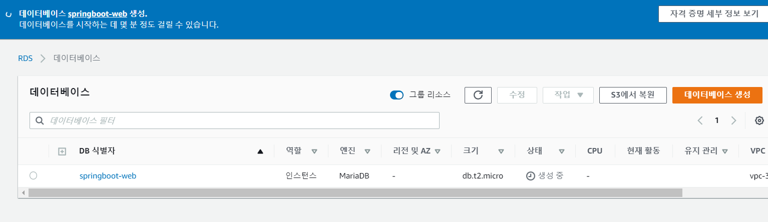 퍼블릭 액세스를 허용하지 않으면 데이터베이스에 직접 접근하지 못하고 같은 VPC안에 있는 EC2에서 우회 접속해야한다. 지금은 그냥 허용하기로 했다. 나중에 변경할 수 있다.
